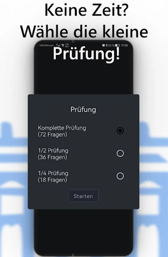 Choose between three different modes: the original mode with 72 questions or the more compact modes with 36 or 18 questions. In all modes the ratio of questions is identical to the original. After each simulated exam you will receive a detailed evaluation.