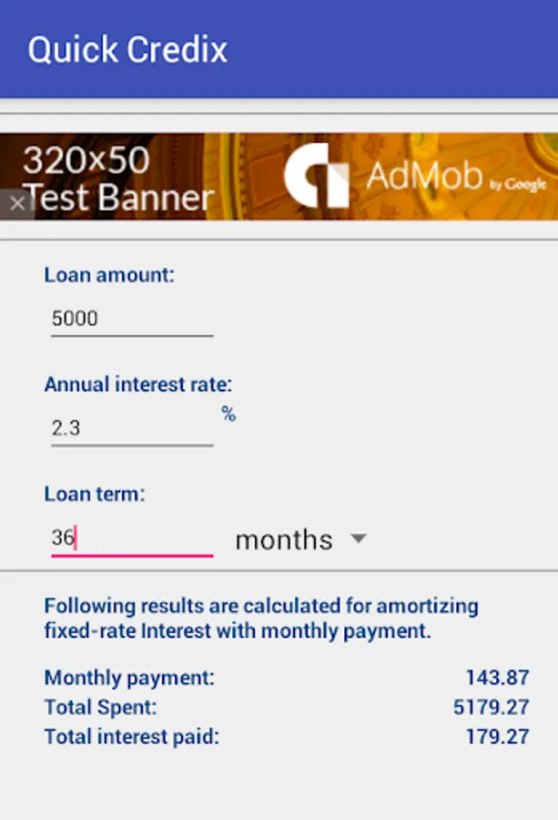 Quick Credix is a free application that calculates Monthly payment, Loan amount or loan tern based on the other data, and total cost of a Mortgage Loan. This is done in an easy way : a single fast and efficient page with all inputs and all results. It includes loan amount, loan term and interest rate. This application is ideal for negotiation with a bank.