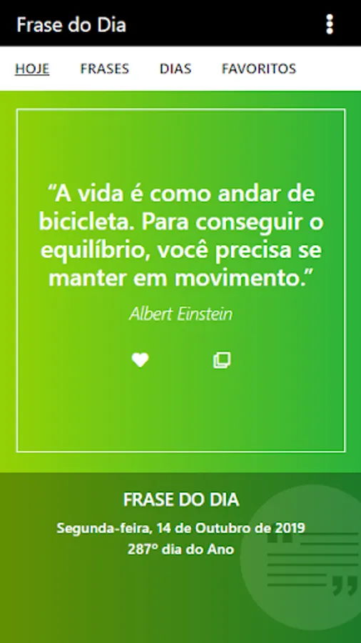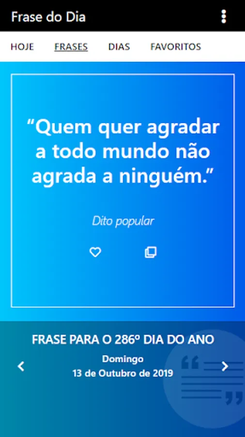 Quote of the Day: Your daily source of motivation and wisdom to brighten your everyday journey. This extraordinary application offers a diverse collection of carefully selected phrases and quotes designed to enrich your mind, inspire your heart and empower you to face life's challenges with renewed confidence. Bookmark your favorite quotes for easy access, or share instantly on social media to spread positivity and touch others' lives. In addition, enjoy the unique possibility of consulting phrases from all the previous days, covering a treasure trove of wisdom that extends through every day of the year until today. Get ready for a transformative journey of self-discovery, personal growth and constant inspiration.