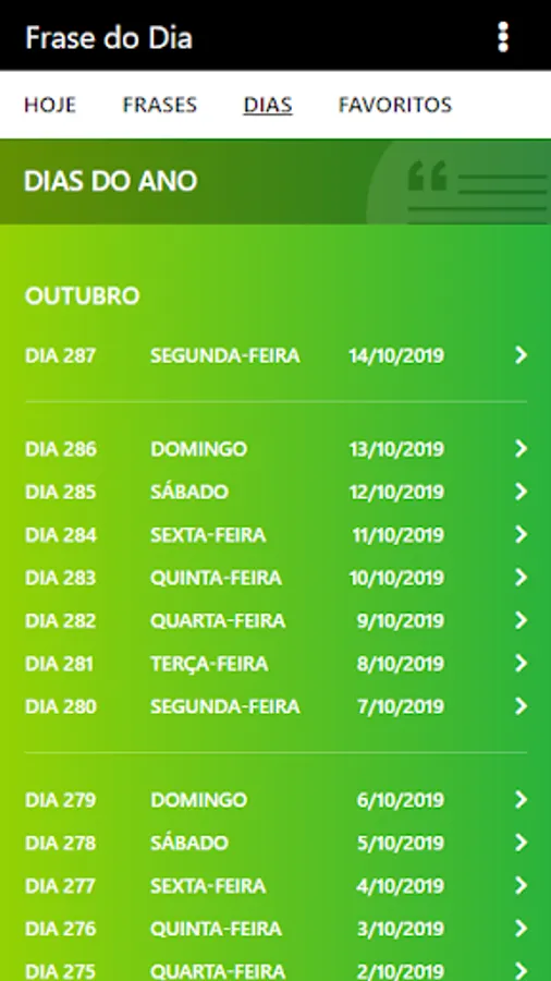 The unique ability to look up quotes from all previous days is one of the highlights of Quote of the Day. With a simple swipe of your fingers, you can explore the treasure trove of wisdom accumulated over the days of the year. Revisit phrases that touched your heart, remember moments of inspiration and find comfort in the words that lit your path. This function ensures that you never miss a dose of motivation and lets you re-experience the powerful energy you felt in days gone by.