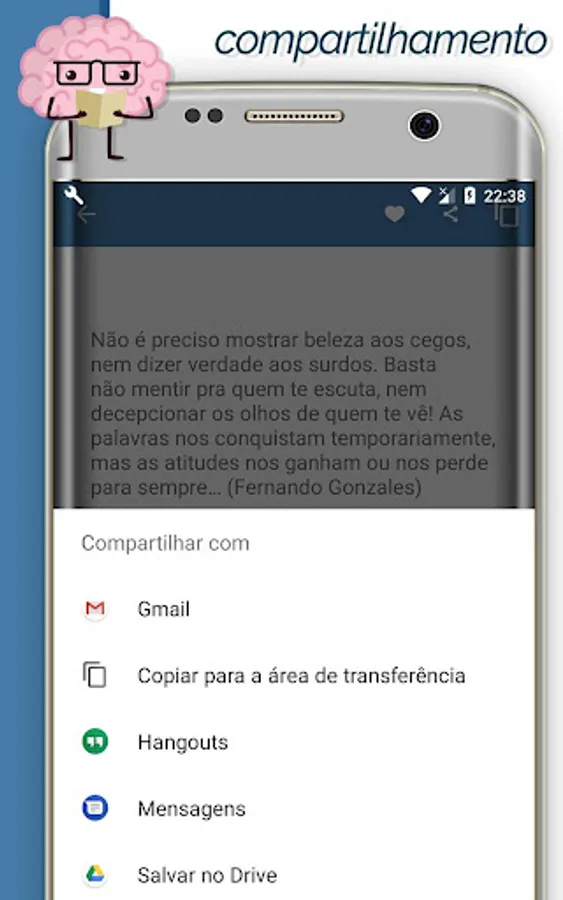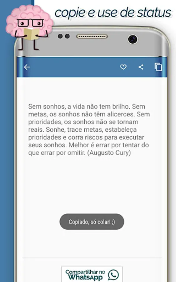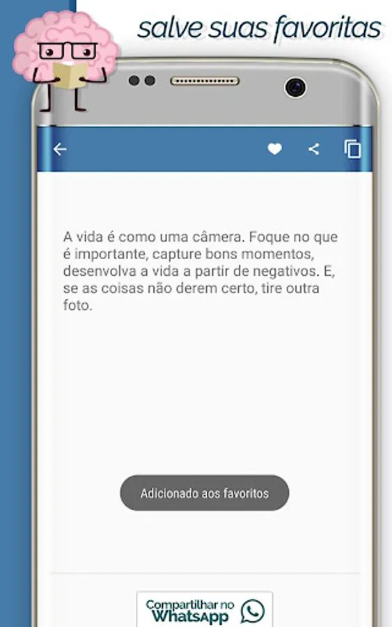 App with phrases made to read, reflect and share with your friends, groups and family, use as good morning messages, good afternoon or good night, also serve as status in face, urge and whatsapp. You can also subtitle user of your photos. Smart adults like to read as a hobby, and nothing better than reading wise words and building their knowledge with the wisdom of these real geniuses like the famous Chico Xavier! Even short sentences have the ability to touch our heart, motivate us on a daily basis and bring us knowledge.