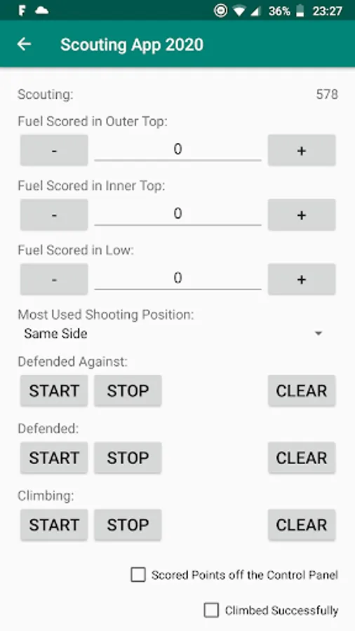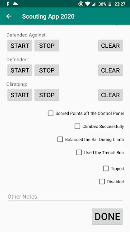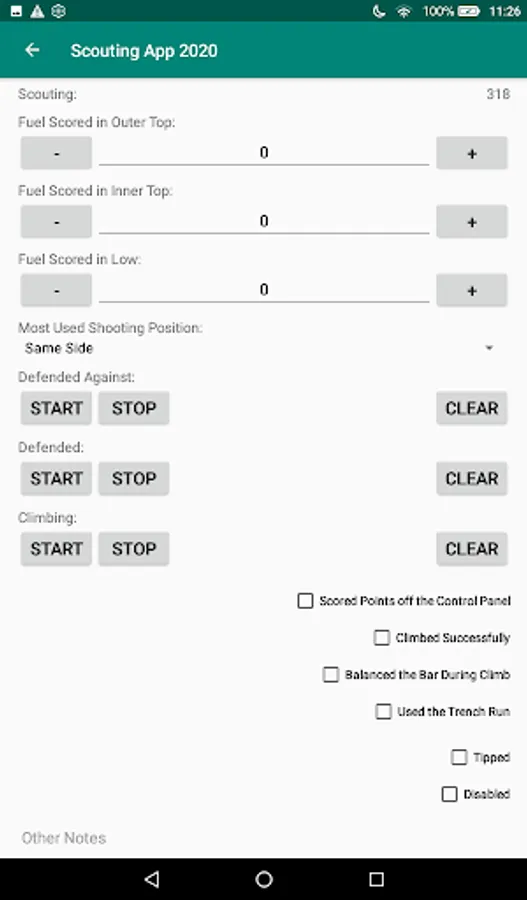 The scouting app features an intuitive GUI for use when scouting other teams during gameplay. It has labelled buttons that control timers, incrementing/decrementing fuel cells scored, and app navigation, it has checkboxes for boolean type data, and it has extra not sections for making sure every last bit of important data is collected. Here’s an overview of each period of the game and what is collected: