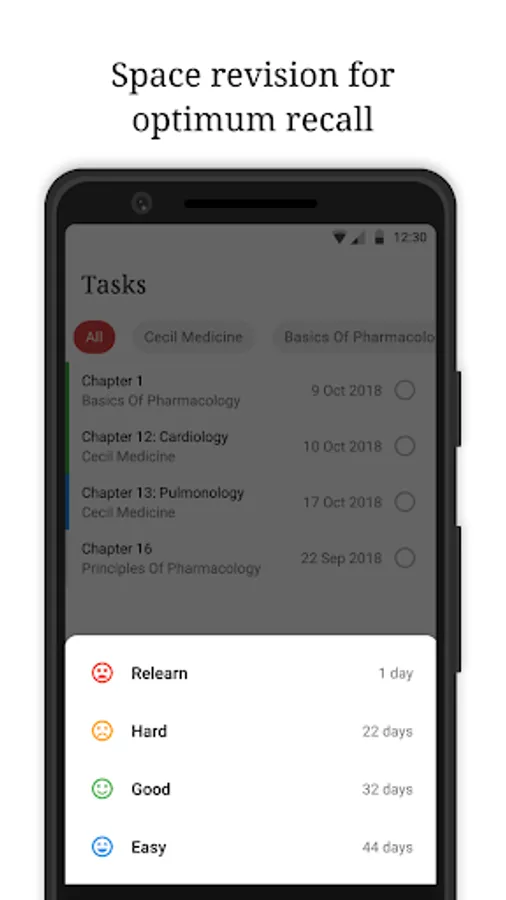Review is a to-do list that schedules revision based on the principle of spaced repetition. Reviews are rescheduled once completed based on their difficulty.