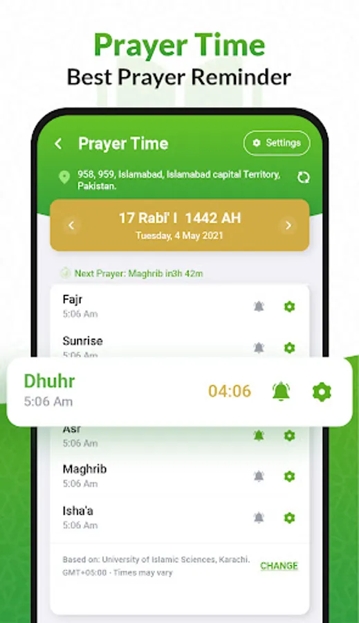 Al Quran app - القران الكريم App will notify you at the time of each prayer, helping you to stay connected to your worship. Manually adjust Prayer time setting according to your convenience. Additionally, in Kuran app you can set alarm for each prayer.