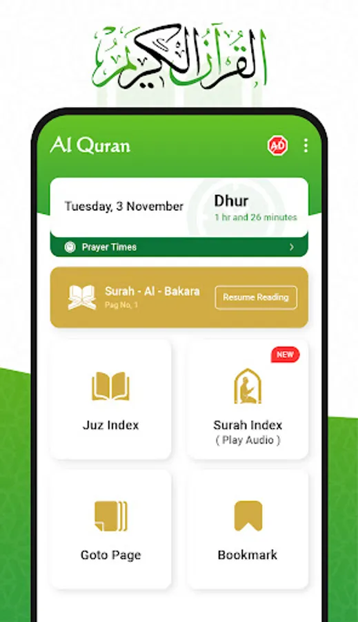 Resume Quran (القرآن الكريم): Click on the Resume button, so it will take you to the page where you left off Quran reading.