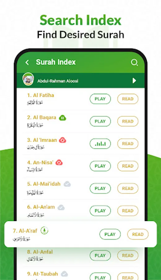 From the main page open any surah index or juzz index for finding the parah or surah which you want to recite or listen. You can also control the audio Quran player from your phone. You can stop, pause, repeat or forward to the next surah.