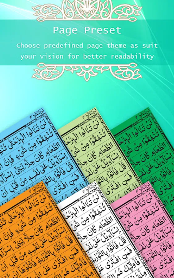 Many themes are provided to do Quran offline tilawat with innovation. Page presets gives a totally changes look of Holy Quran pages with eye cathching combination of colored background and text.