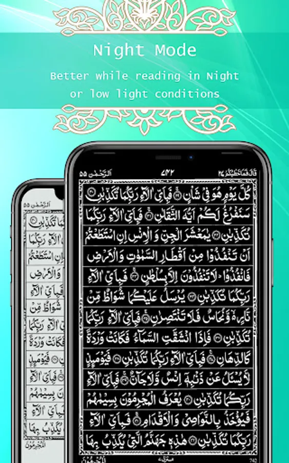 Different modes are to be set for the day and night timings for comfortable reading environment and mood with real Quran page to avoid pinching light in the eyes. Night mode will turn the background black and text color into white which will give you suitable reading screen at night or poor light conditions.