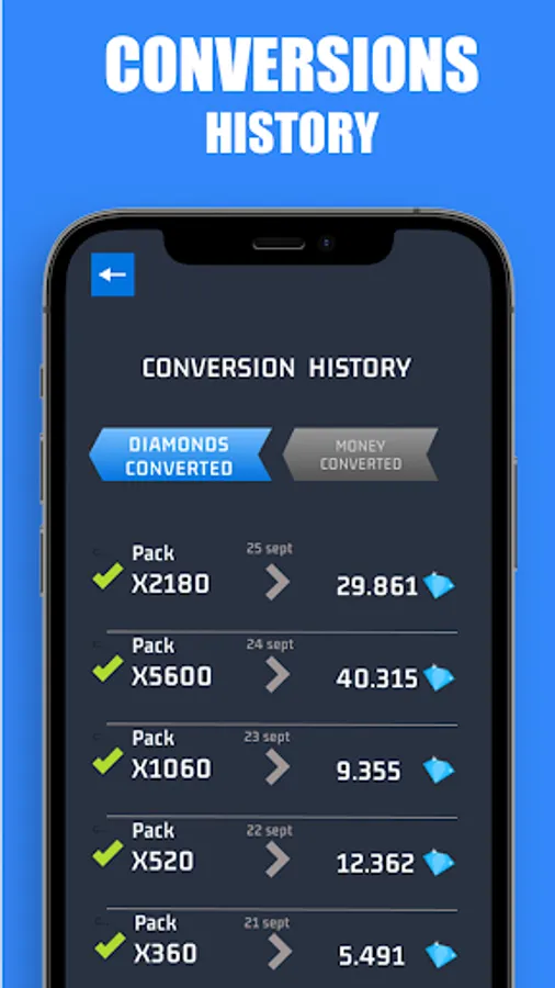 In this summary you can see your history of diamond conversions made. It is basically a brief conversion history and recent calculations that will give you a quick overview of your activity.