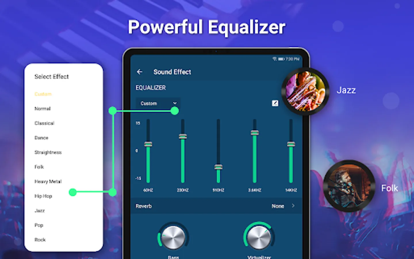 Includes Normal, Dance, Flat, Folk, Heavy Metal, Hip hop, Jazz, Pop, Rock and so on . It provides you powerful equalizer and multiple tones.