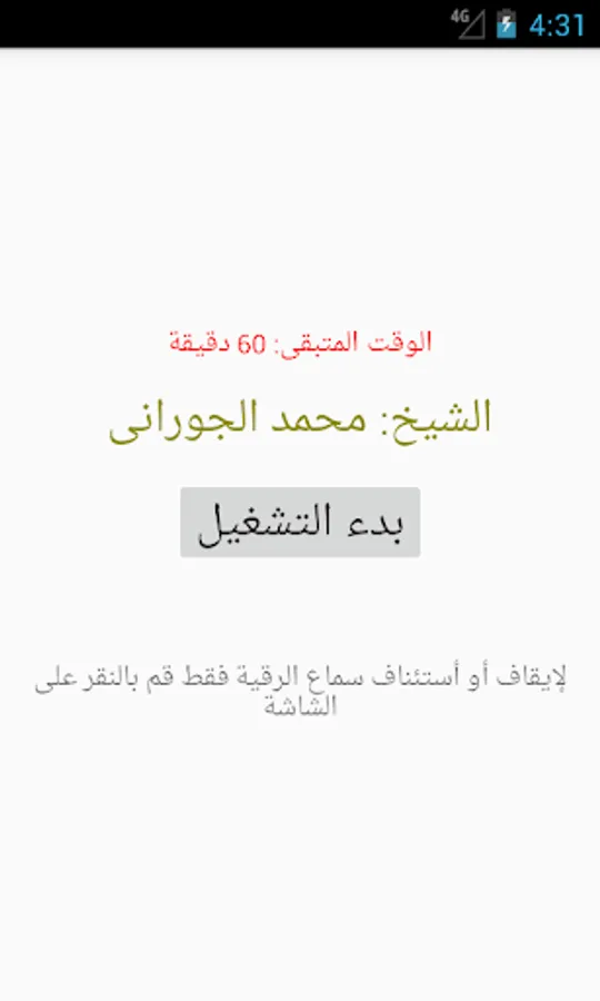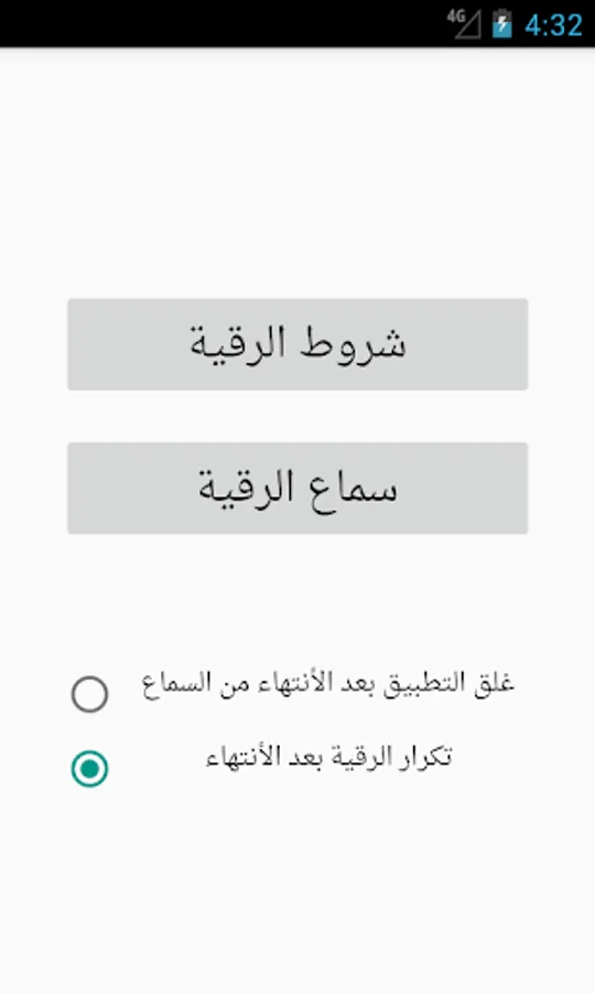تطبيق بسيط لا يحتاج نت لسماع الرقية الشرعية ... كما يمكنك ضبط التطبيق لغلق نفسه بعد سماع الرقية وذلك لتوفير البطارية