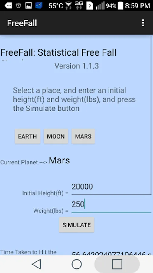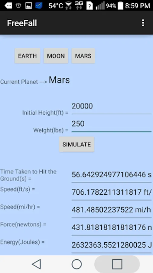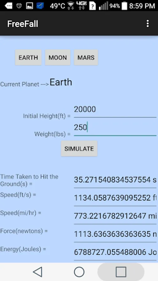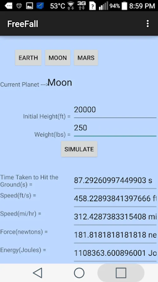 FreeFall simulates free falls on Earth, the moon, and Mars. Input your weight(in pounds or kilograms), and your initial height from the ground(in ft or m), and FreeFall will tell you: