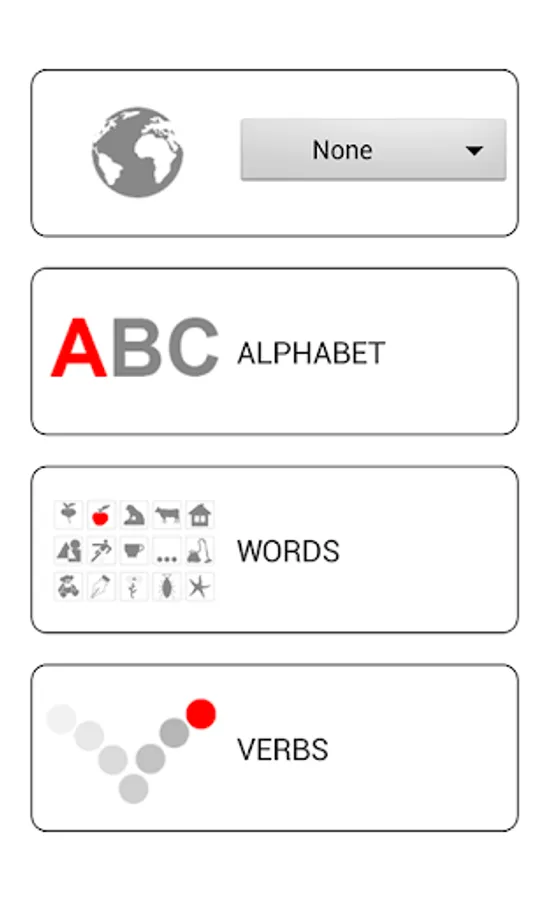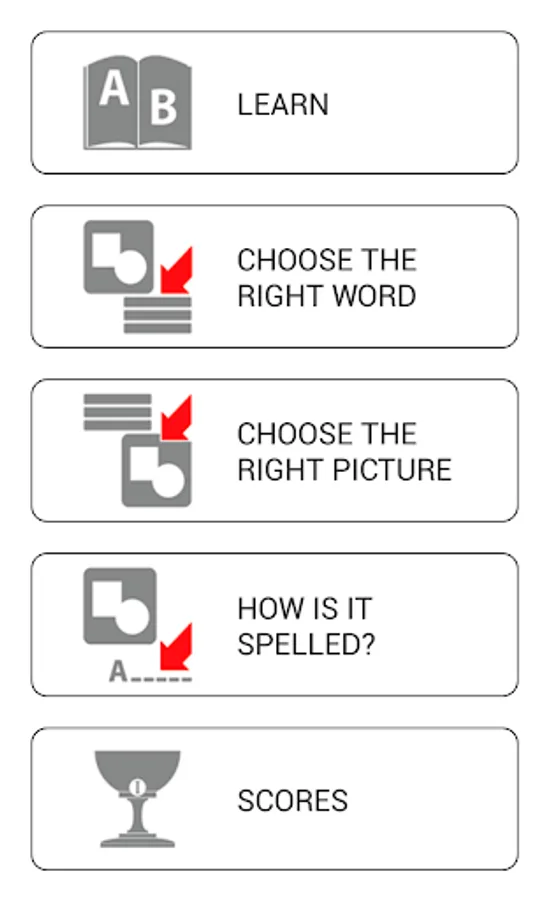 • Language quiz – testing of the knowledge of the words happens through fun and simple games:
