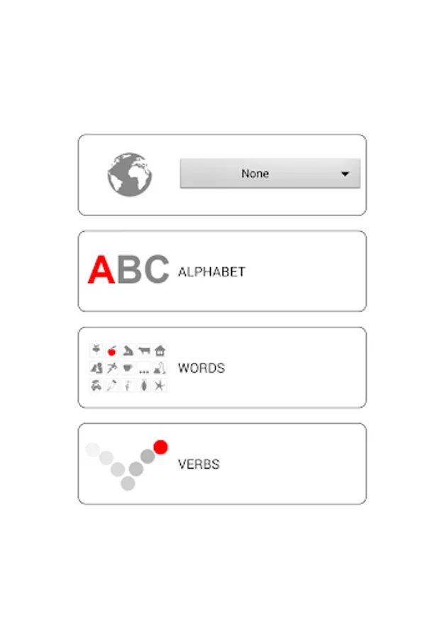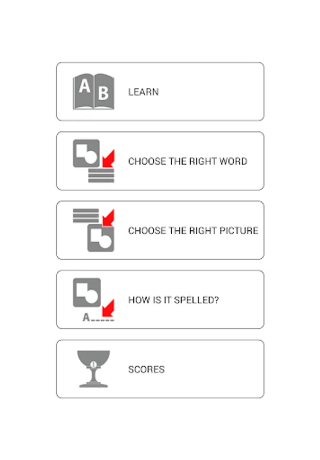 • Training – learning the alphabet ABC, parts of speech, such as nouns, adjectives and verbs with phonetic transcription through flashcards and sound accompaniment.
