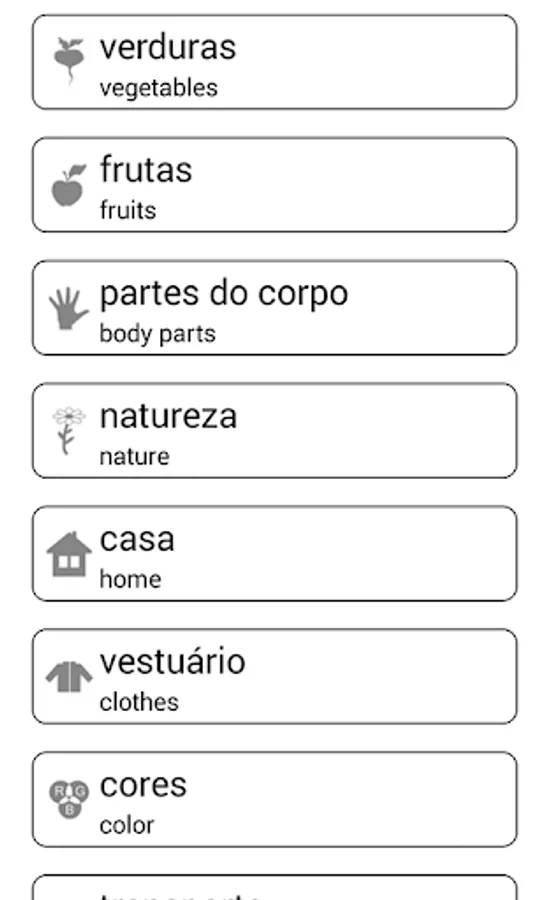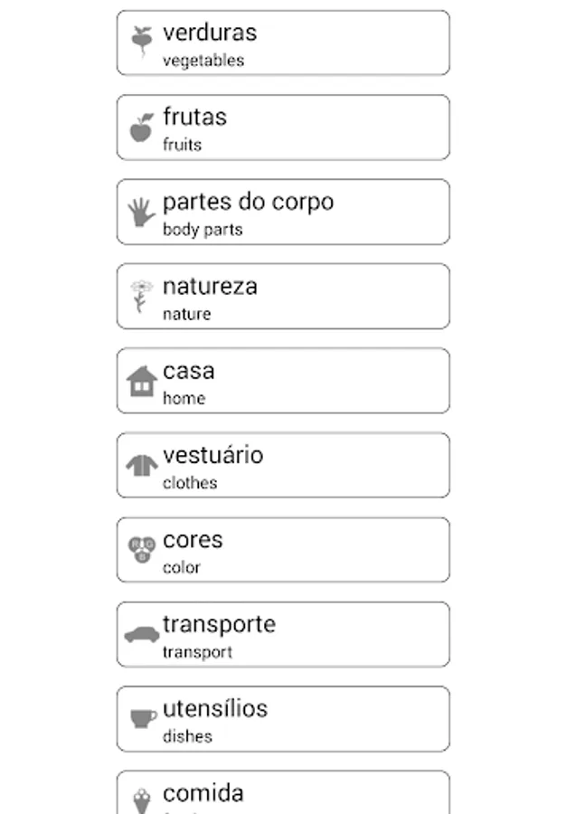 The app contains the following topics: vegetables and fruits, wild animals, domestic animals, animal body parts, birds, sea life, home, bathroom, clothes, colors, transport, human, body parts, tableware, home appliances, food, toys, school, nature, natural phenomena, insects, numbers and figures, geometric shapes, musical instruments, tools, sport, summer sports, winter sports, travel, entertainments, office, infrastructure, shop, society, professions, information technology, prepositions.