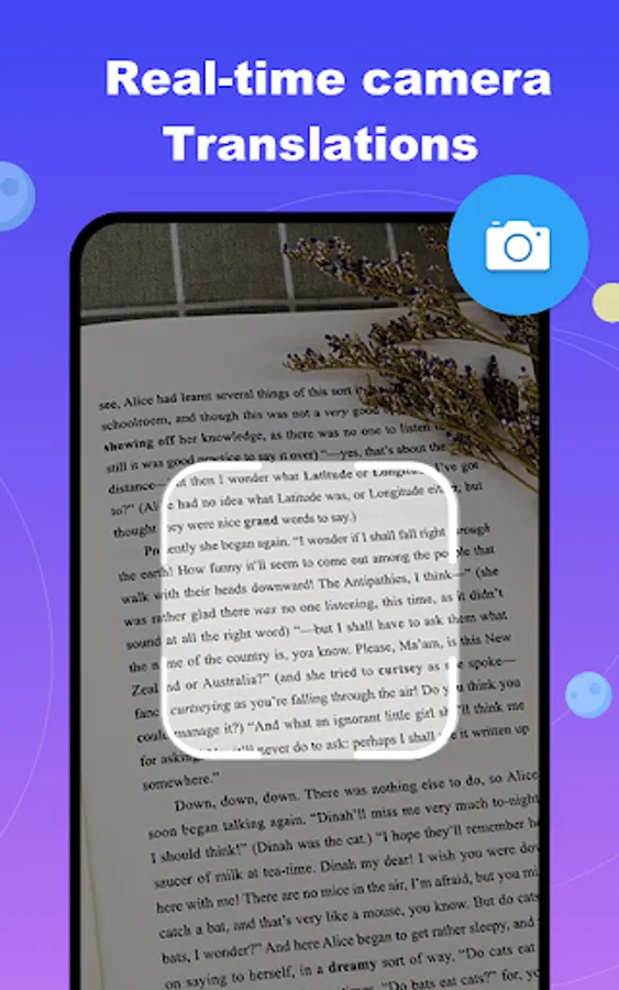Point your camera at menus, road signs, or documents and get instant translations. No need to type manually.