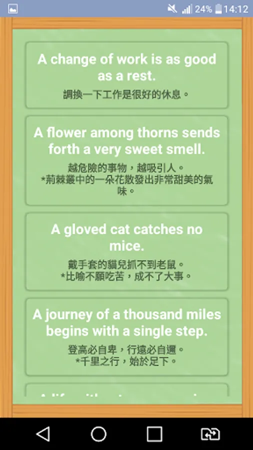 Simple operation, 14 types of classified proverbs, corresponding Chinese four-character idioms, Chinese and English contrasted learning. A good helper for learning English and a good assistant for English composition.