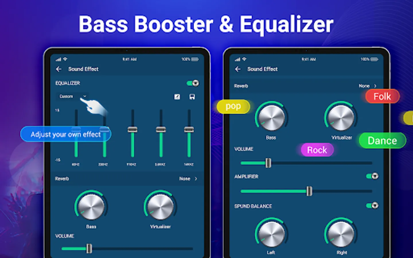 - Boost your music experience with 20+ amazing presets, 5 bands, bass booster, music virtualizer & 3D reverb effects adjustments and much more.