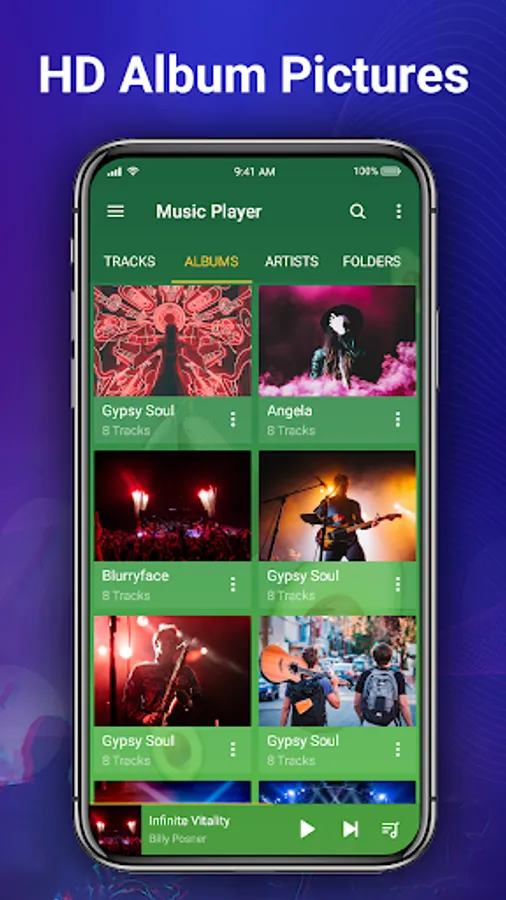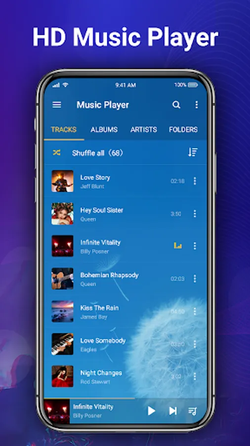 Music Player supports all music and audio formats including MP3, MIDI, WAV, FLAC, AAC, APE, etc. And play them in high quality.