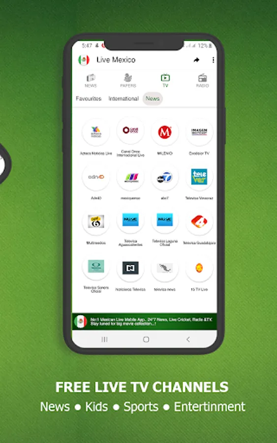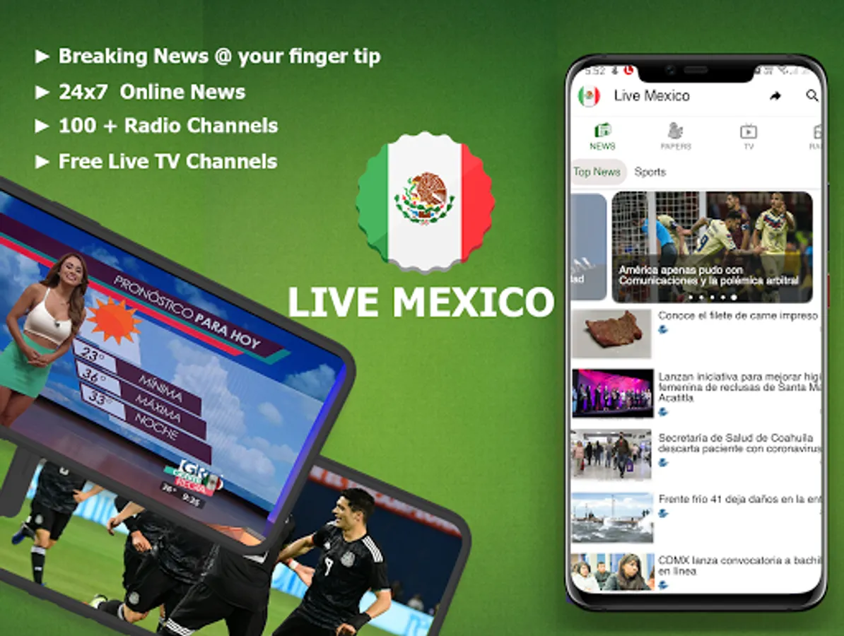 Live Mexico is a complete news browser application which brings the latest Mexico news updates, Mexico Live TV shows, and Mexico Live Radio at your hands instantly. Get and enjoy real-time Mexico Online News, Mexico Live News TV Channels and Mexico Entertainment TV Channels. Live Mexico offers you a stream-less experience of Mexico Live Radio Channels