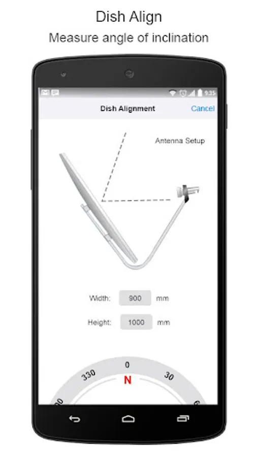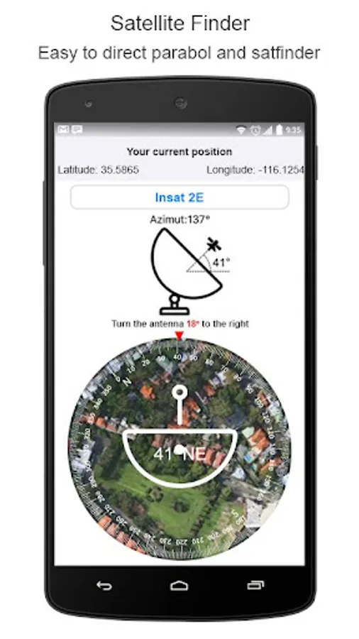 Satellite dish finder app helps you to align your satellite antenna. Based on your current location and the selected satellite, it will shows you in which horizontal and vertical direction you have to align your antenna. You can select from list of 300+ satellites. You can get LNB azimuth angle, elevation value and tilt for your location based on selected satellite.