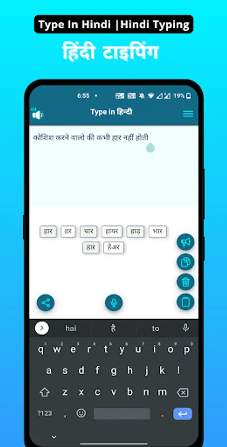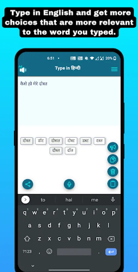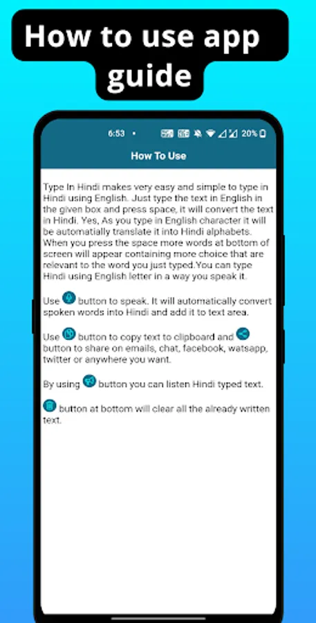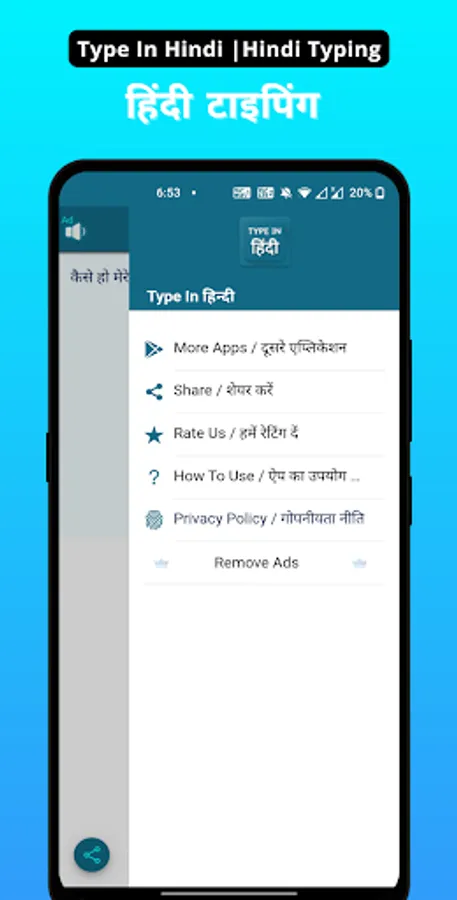 - No keyboard or any technical configuration required. Simple type in english like words and app will convert it to Hindi.
