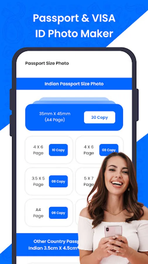 This app is supported in 47+ countries. In this app's premium version ( in-app-purchase ) you can experience This App’s wonderful editing features and much more. Following official Passport & VISA/ID Photo Maker are supported by Passport size photo maker, Afghanistan Passport Photo, Albania, Algeria, Argentina, Australian Passport Photo, Photo for Australian VISA, Austria, Azerbaijan, Bahamas, Bangladesh Passport Photo, Belarus, Belgium, Belize, Bolivia, Brazil, Bulgaria, Burundi, Cambodia, Cameroon, Canada Passport Photo, ID Photo for Canada, Canadian VISA Photo, Chad, Chile, China Passport Photo, Colombia, Cuba, Czech Republic, Democratic Republic of the Congo, Passport photo for Denmark, Denmark VISA Photo, Dominican Republic, Ecuado, Egypt, Ethiopia, Finland, France ID Photo, France Passport Photo, VISA Photo for France, German Passport Photo, Photo for German VISA, Ghana, Greece, Guatemala, Haiti, Honduras, Hong Kong Passport Photo, Photo for Hong Kong ID, Hungary, Indian Passport PhotoIndia VISA Photo, Photo for Indian OCI/PAN CardIndonesia, Iran, Ireland, Israel, Photo for ItalyItalian Passport Photo, Italian VISA Photo, Ivory Coast, Jamaica, Japanese Passport Photo, Photo for Japan VISA, Kazakhstan, Kenya, Photo for Republic of Korea, Korean Passport Photo, Korea VISA Photo , Lebanon, Madagascar,PassportPhoto, Photo for Malaysian VISA / ID, Mali, Mexico, Morocco, Mozambique,, Myanmar, Nepal MRP Size Photo, Photo for Nepal Passport, Netherlands Passport Photo, Photo for Netherlands, New Zealand Passport Photo, Niger, Nigeria, Norway,Pakistan Passport Photo, Photo for Pakistan ID, Palestine, Peru, Philippines Passport Photo, Photo for Philippines ID and VISA, Poland, Portugal Passport Photo, Photo for Portugal ID and VISA, Republic of the Congo, Romania, Russian Passport Photo, Photo for Russia ID and VISA, Rwanda, Saudi Arabia Passport Photo, Photo for Saudi Arabia ID, Serbia, Singapore ID Photos, Photo for Singapore Passport, South Africa, Spain Passport Photo, Photo for Spain ID and VISA, Sri Lanka, Sweden Passport Photo, Switzerland Passport Photo
