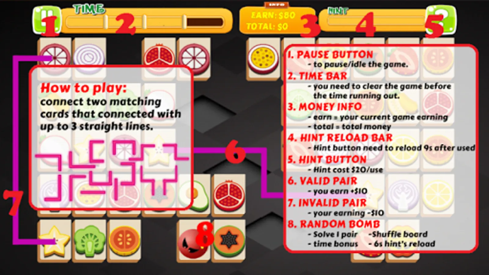 The rules is to connect 2 matching cards that connected with up to 3 straight lines.