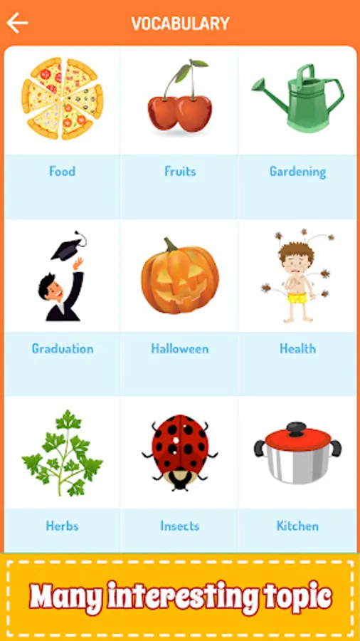 This English learning app is abundant in subjects used in daily situations such as: Colors, Animals, Insects, Alphabet, Numbers, Shapes, Fruits, Food, Body Parts, Transport, Clothes, Sports, Vegetables, Verbs, Occupations, Appliances, Emotions, School, Places, Kitchen, Weather, Bathroom, Living room, Flowers, Country Flags, Musical Instruments, Fairy Tales, Solar System, Ancient Greece, Ancient Egypt, Daily Routines, Camping, Winter, Plants, Firefighting, Summer Time, Road Signs, Construction Machinery, Prepositions of place, etc.