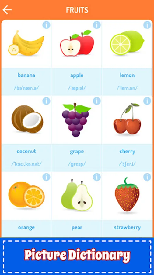 Our English learning app is very useful for your kids who need to improve English vocabulary, listening and reading skills. You can let your kids learn English with a wide range of vocabulary and lots of learning games for kids such as: listening, spelling games, reading games, ABC games for kids, etc.