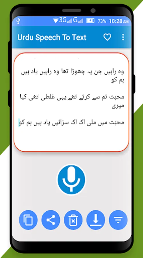 Urdu Voice Typing Keyboard makes simple and easy use for those people who don't want to spend time in Urdu Typing. It is very easy and simple to get Urdu Text in mobile using your Voice in Urdu.