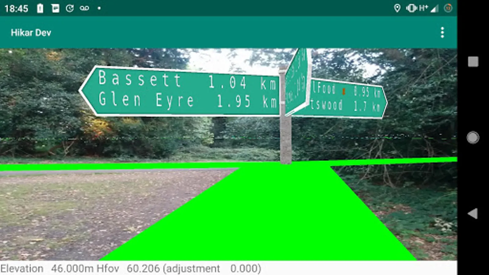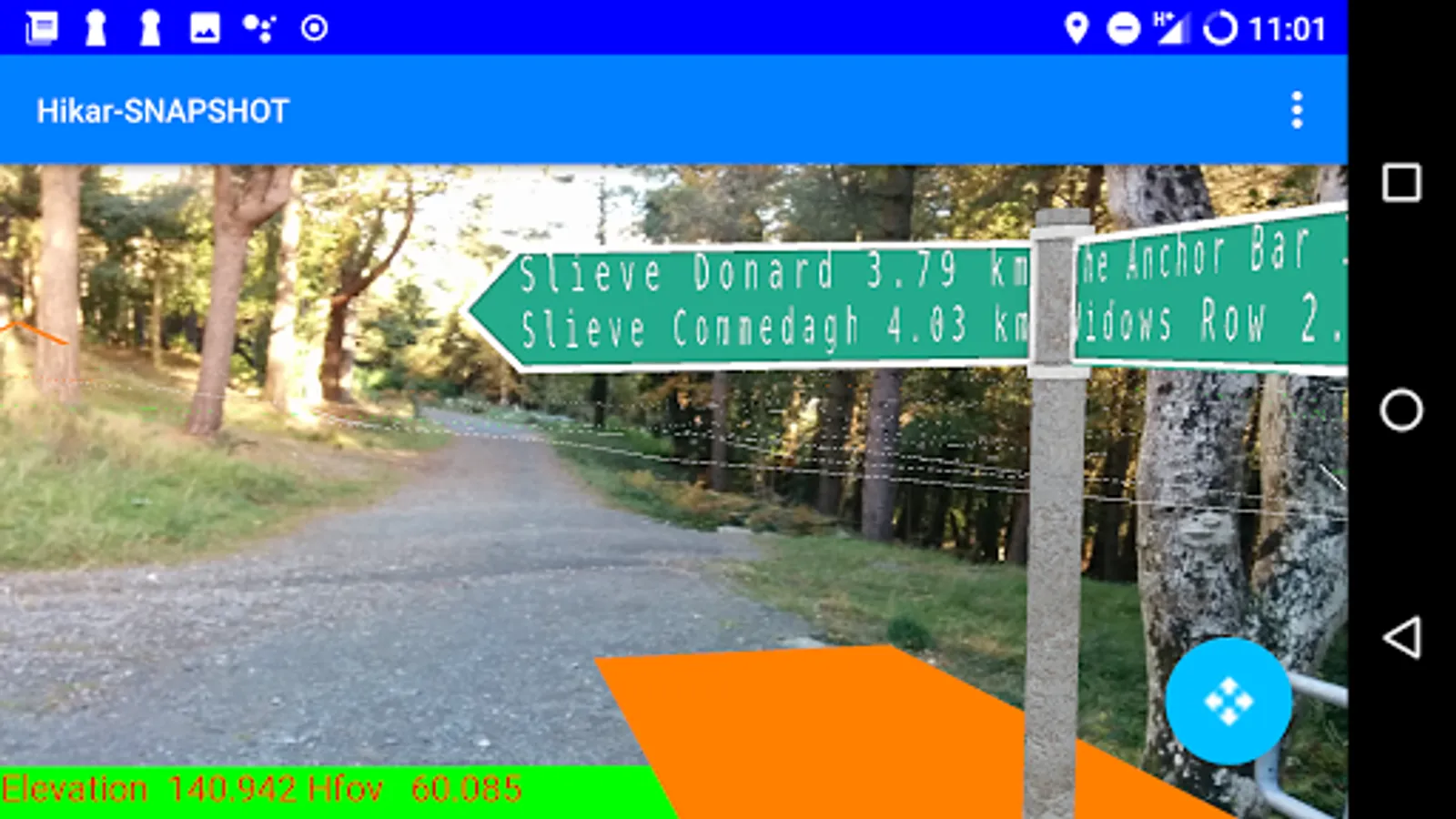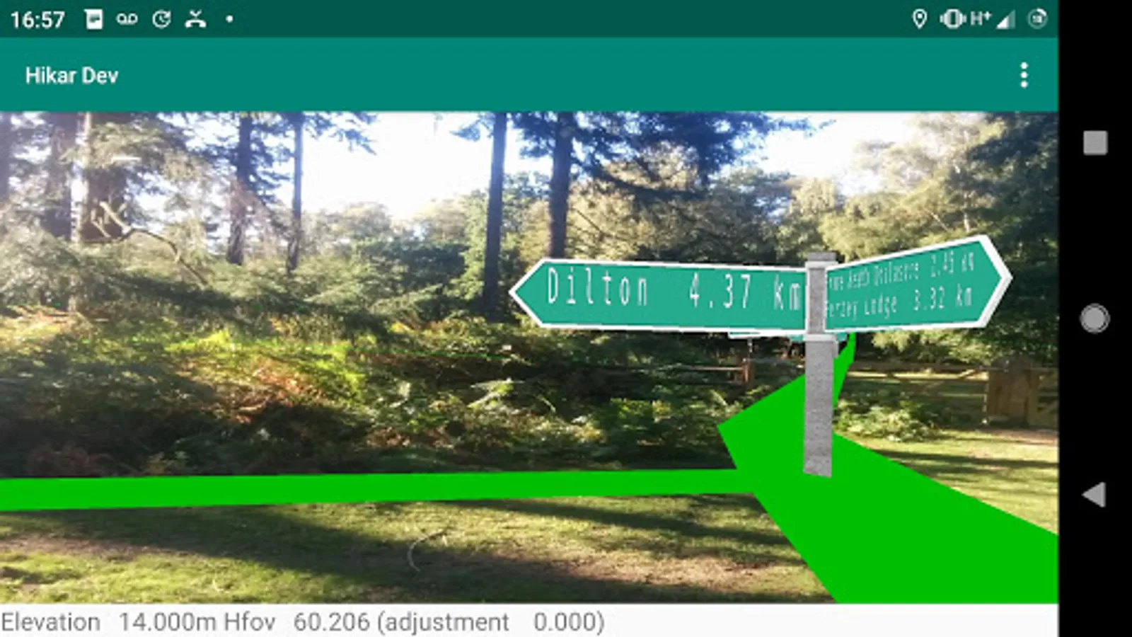 Its aim is to help navigation for walkers/hikers (hence the name) and other outdoor users. For example, imagine you are entering a large field and it's not clear where the exit is. Hikar will overlay the course of the footpath on your phone's camera feed helping you to navigate across the field. Or, you're at a junction of paths and it's not clear which is the correct way. Hikar will show a virtual signpost, showing the direction and distance of nearby points of interest such as villages, hills, mountains or pubs. Or, you're having to make your way across a pathless moor. Again, Hikar will help you find the way.