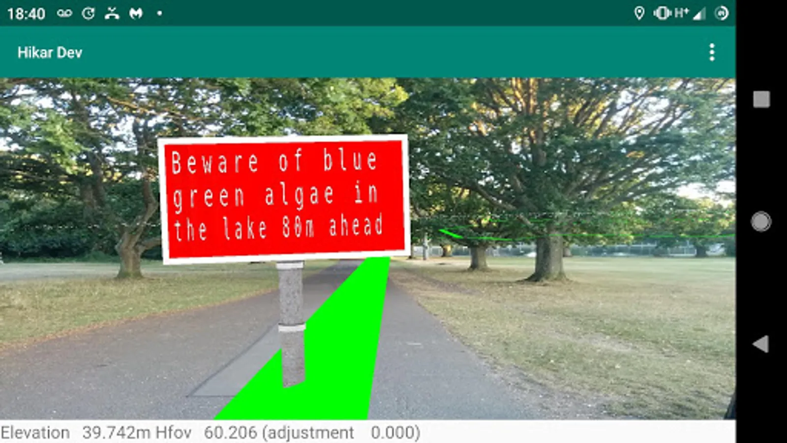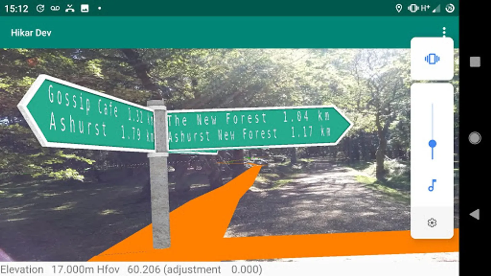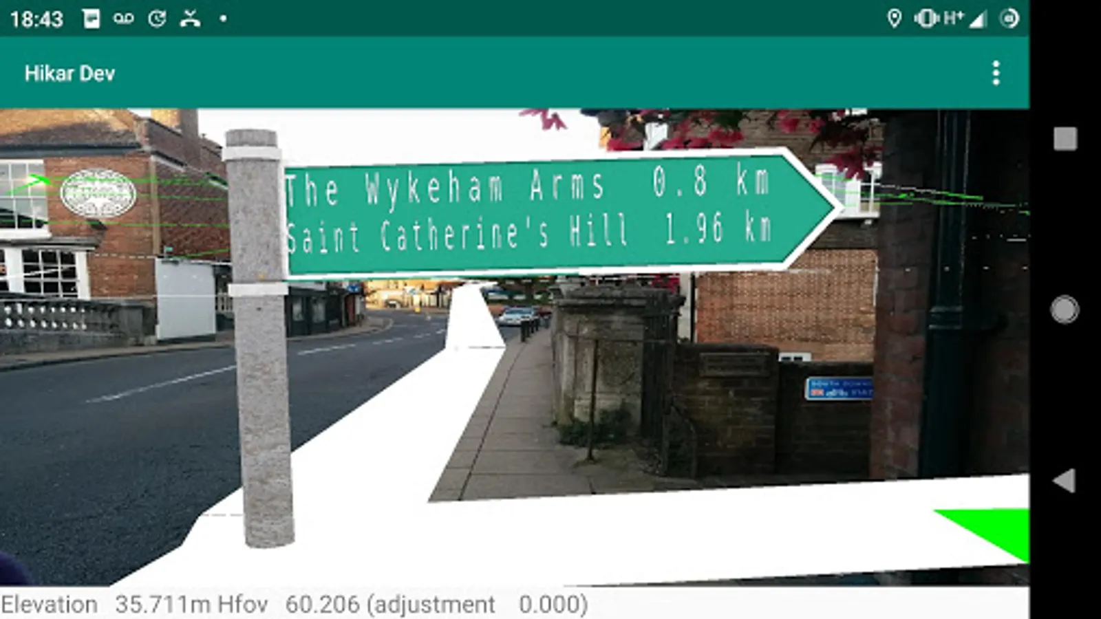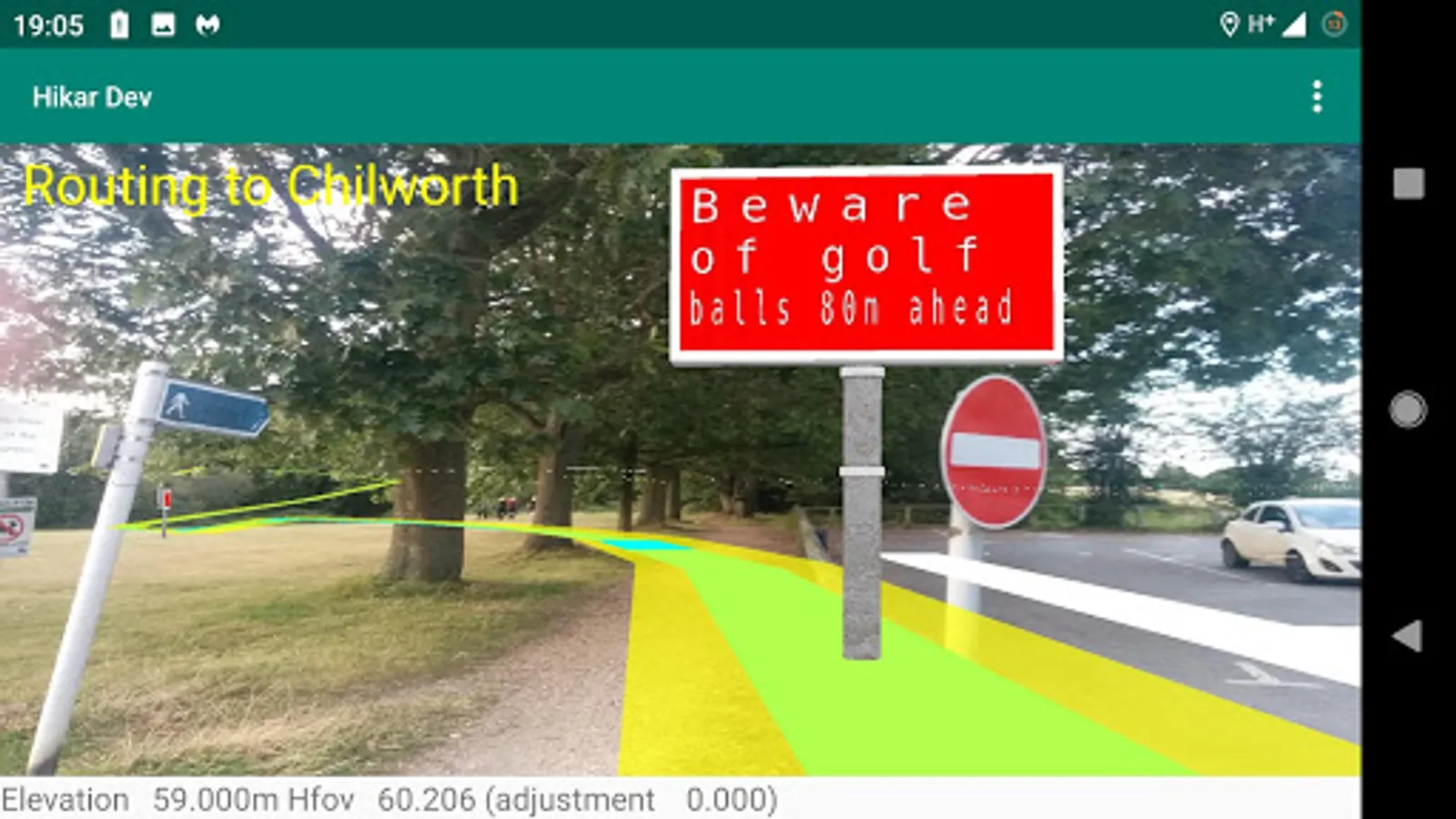 Its aim is to help navigation for walkers/hikers (hence the name) and other outdoor users. For example, imagine you are entering a large field and it's not clear where the exit is. Hikar will overlay the course of the footpath on your phone's camera feed helping you to navigate across the field. Or, you're at a junction of paths and it's not clear which is the correct way. Hikar will show a virtual signpost, showing the direction and distance of nearby points of interest such as villages, hills, mountains or pubs. Or, you're having to make your way across a pathless moor. Again, Hikar will help you find the way.