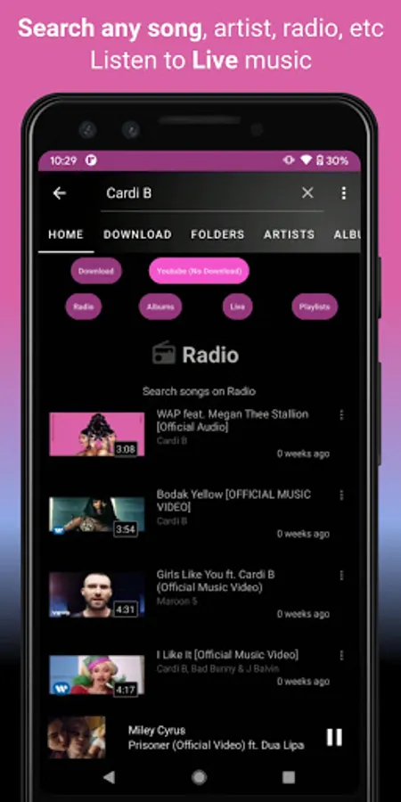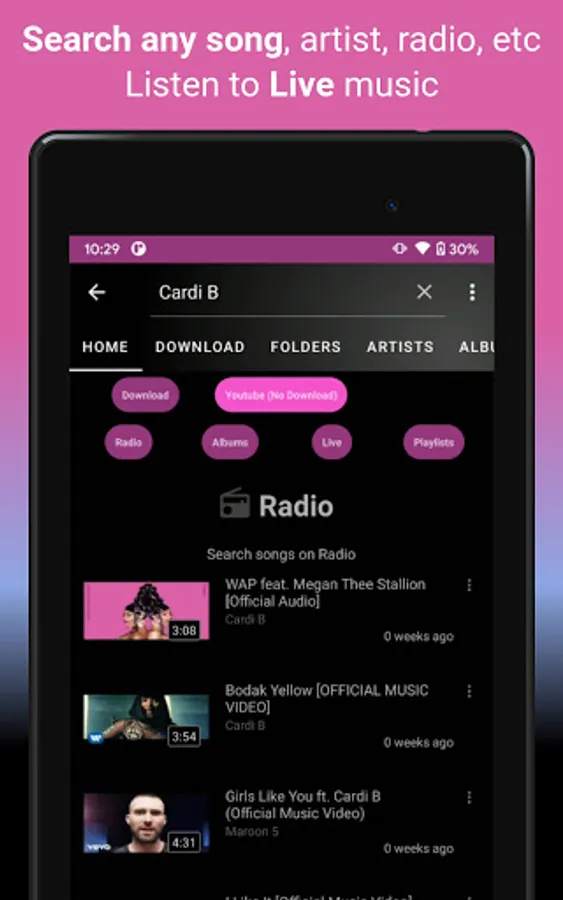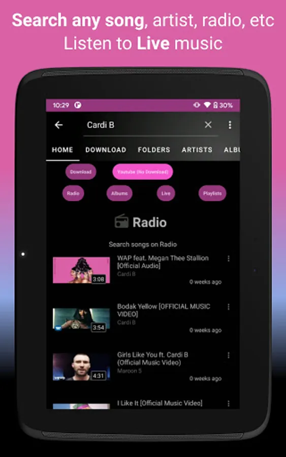 Video Music Player Downloader takes download enabled music and videos offline to play in the background anytime with an equalizer, variable speed, and bass boost. Download 30 million+ songs with a fast MP3 downloader. Watch videos, and listen to offline music and FM Radio even when the screen is off in the background.
