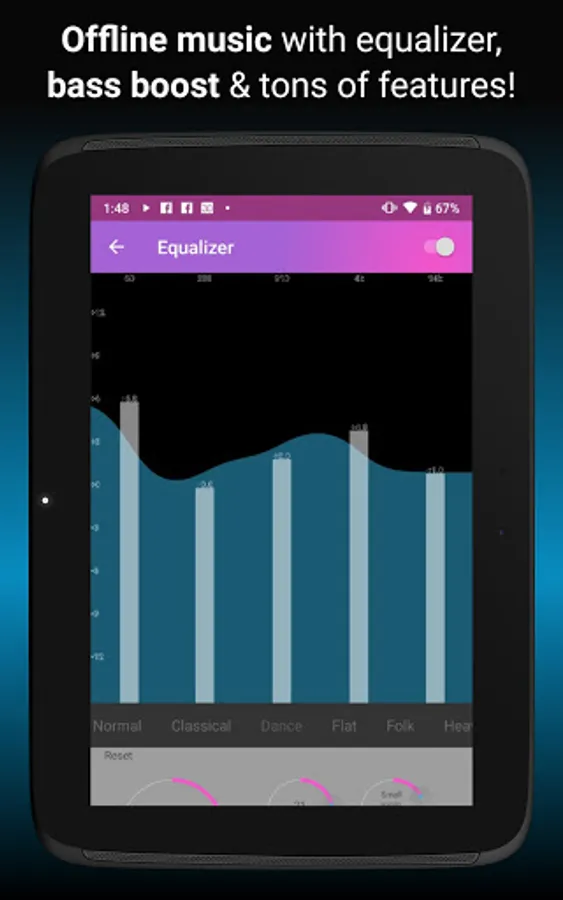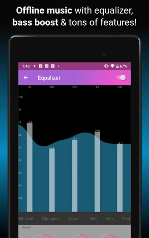 * 5 bands equalizer. Presets: Classical, Dance, Folk, Heavy Metal, Hip Hop, Jazz, Pop, Rock, Electronic, Small speakers, Flat, Normal