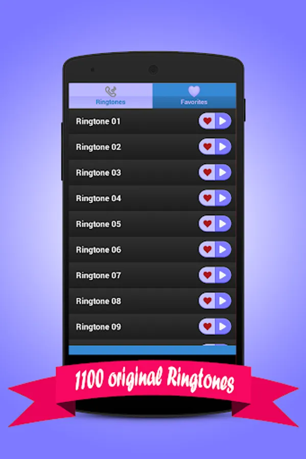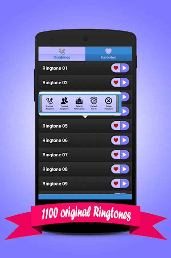 1. Open this application “1100 Original Ringtones”, you can press the " play " button to listen to the Ringtones. If you like one of the 1100 ringtones you can set it as your default phone ringtones, alarm or notification.