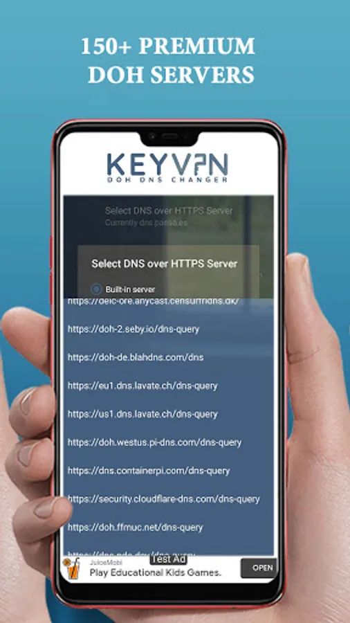 KeyVpn Dns Changer - lets you customize your DNS server provider. You can use your own server, or pick from popular providers like Cloudflare or Google.