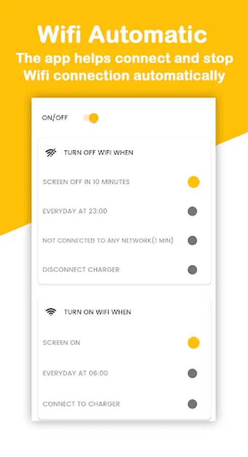 With Wi-Fi Auto Connect app Device Screen is On the WiFi gets Connected, When the device is getting charged the WiFi gets Connected and when the user launch the WiFi required apps then also the WiFi get connected Automatically. When the Device get out of the WIFi Range and the WiFi is not required by the apps then WiFi Automatically get turned Off. Auto WiFi On/Off (Not support android 10 and above devices)