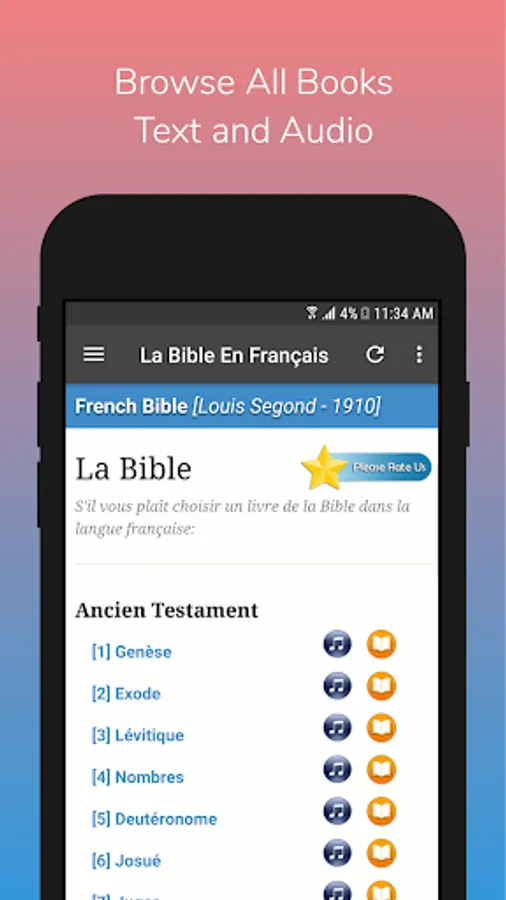 ★ Audio Bible each chapter: This application will read the verses in French! Click on the Audio button next to the book name and listen! (Internet connection required)