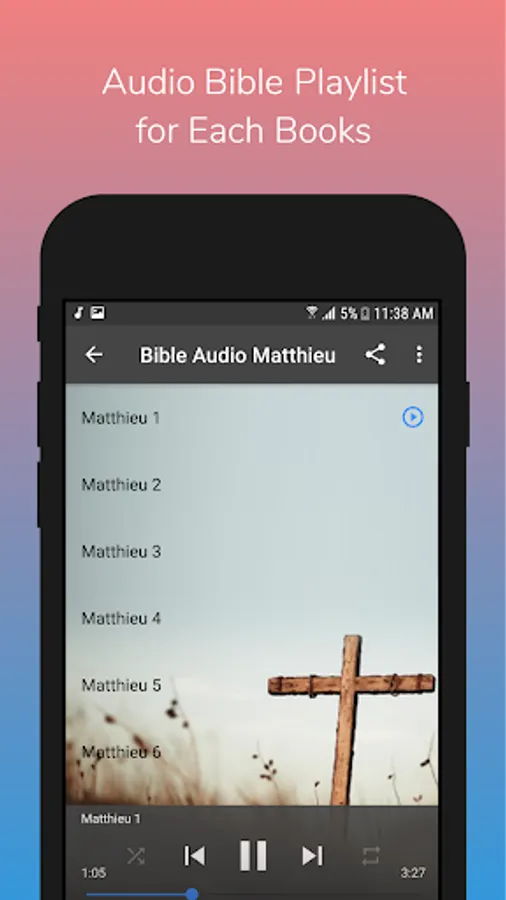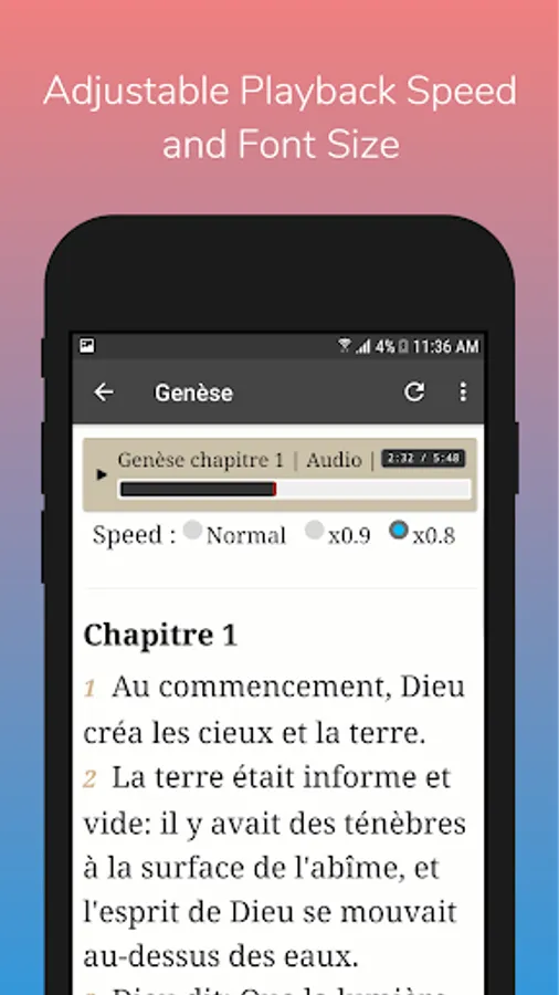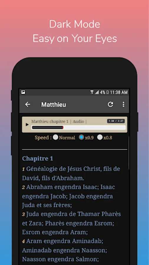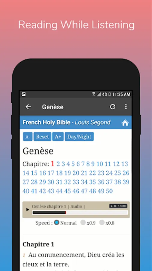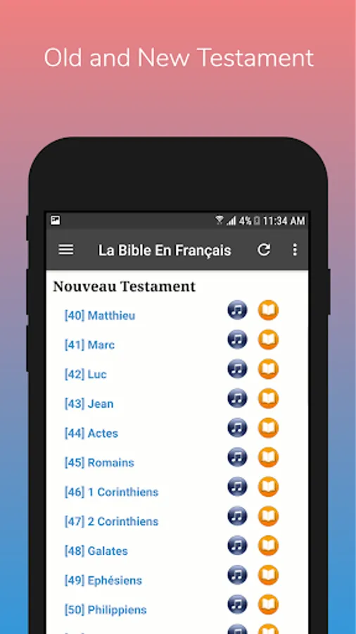 In Bible reading section, we offer the Holy Bible with audio narration in French for you. With this feature you can read and hear the word of God at the same time. It also comes with audio bible playlist of each book. This can also save you time to read. You can learn the Holy Bible while driving or cleaning your house. Play a passage you’ve read before and see what new insights you gain from just listening.