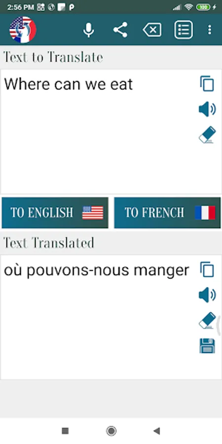 First you type your words to translate and then you choose among 2 buttons if you want your text will be translated in French, you tap French and if you want in english you tap english.