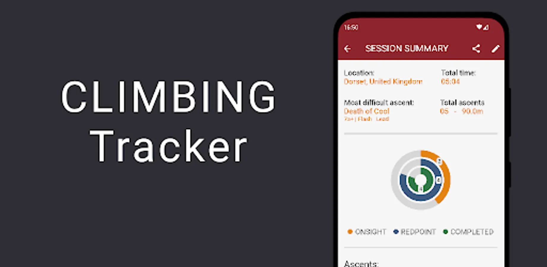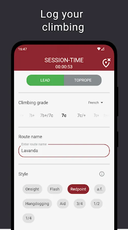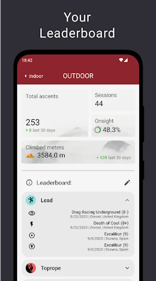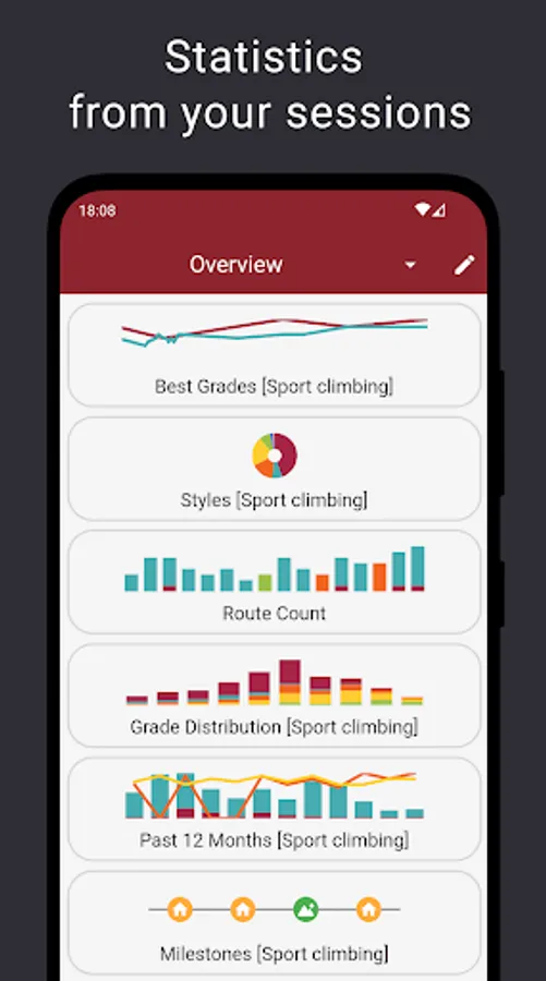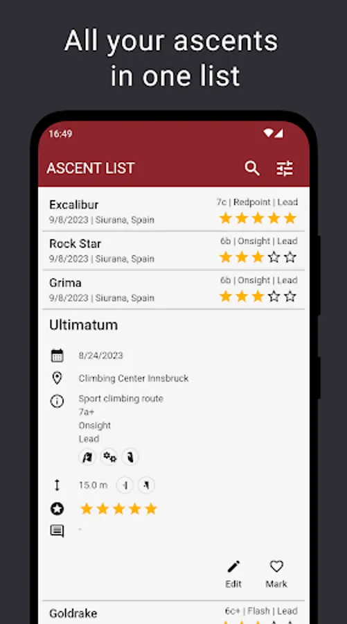 Log all of your climbing activities. Easily save your ascents in this app. Specify the route grade, ascending style, name, and give it a rating. Clear statistics are created from the data, so you always have an optimal overview of your progress.