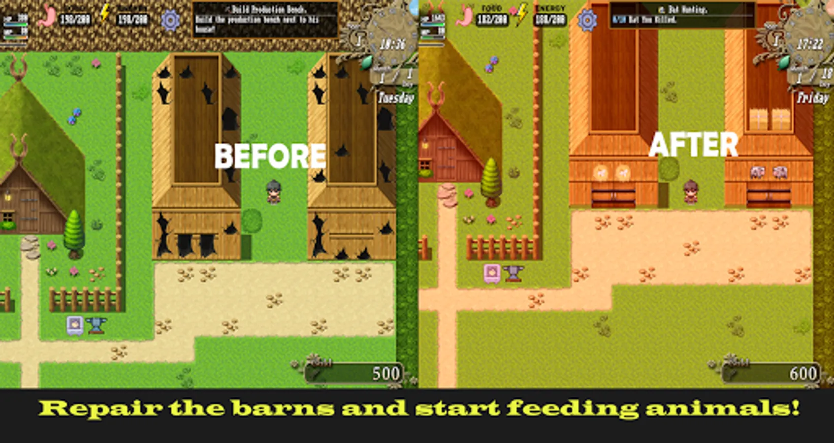 ● Build barns and feed your animals, collect products!