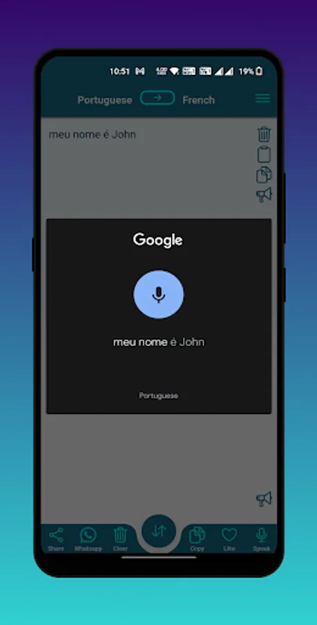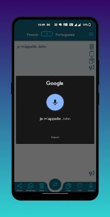- App contains android's inbuild voice translator feature to make it look like translator ai which will convert your voice into text and after that you can convert those spoken words into Portuguese and French.