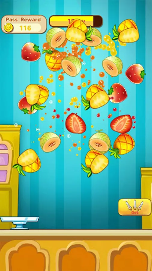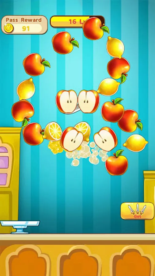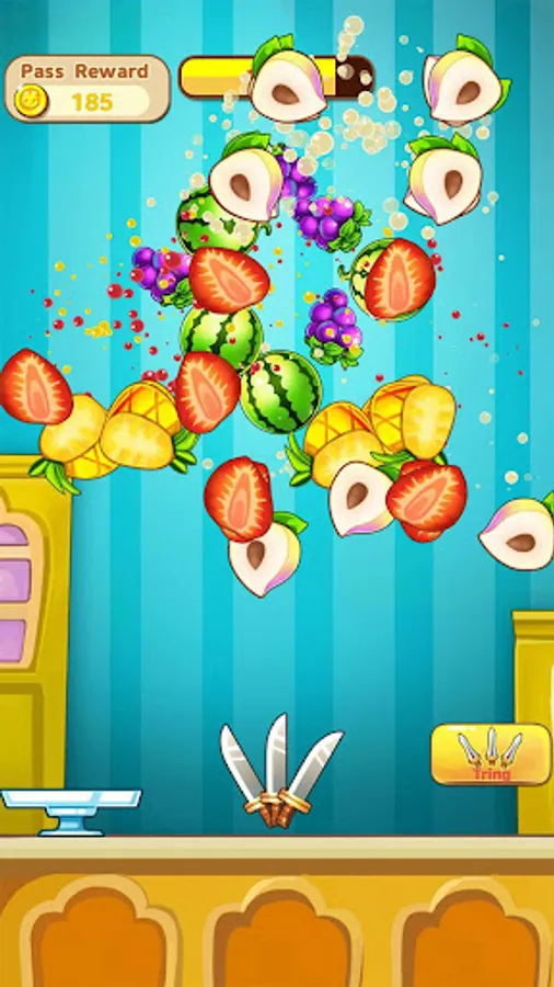 Throw your weapon at the fruits and try to chop all of them at once. Attention, please! The fruits are in moving formation, but you should never miss any of them. If you cut all the fruits, you will pass the level and get a new weapon.