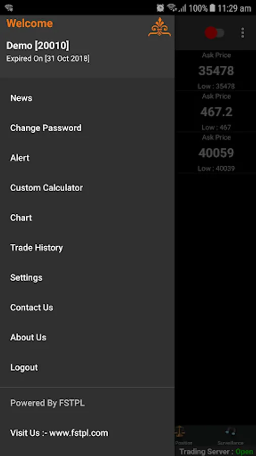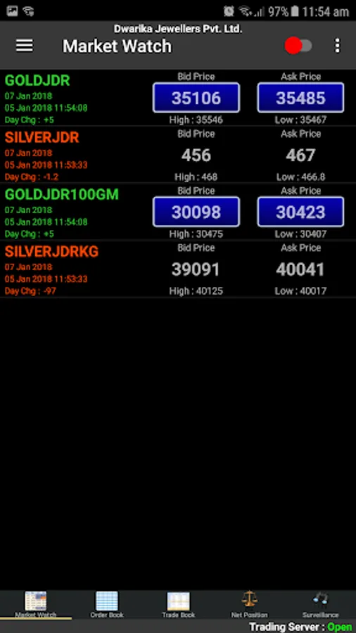 The Trade History feature provide trade history function. Using this function you can get last 20 days tick to tick data for all commodities traded on DJPL SPOT.
