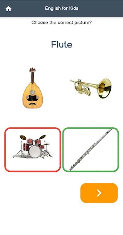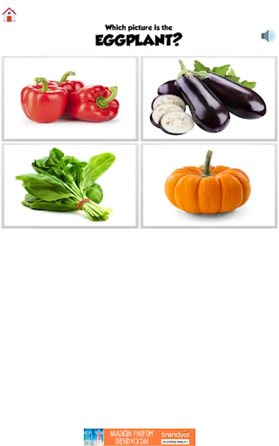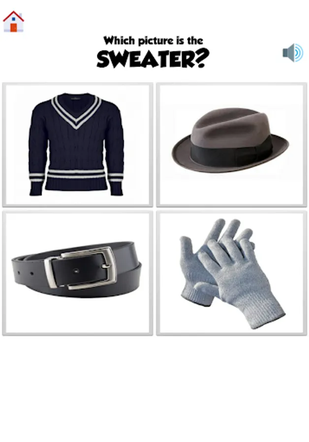 Game 2: One random English word from the selected category is displayed and you are asked to select the correct picture from the options.