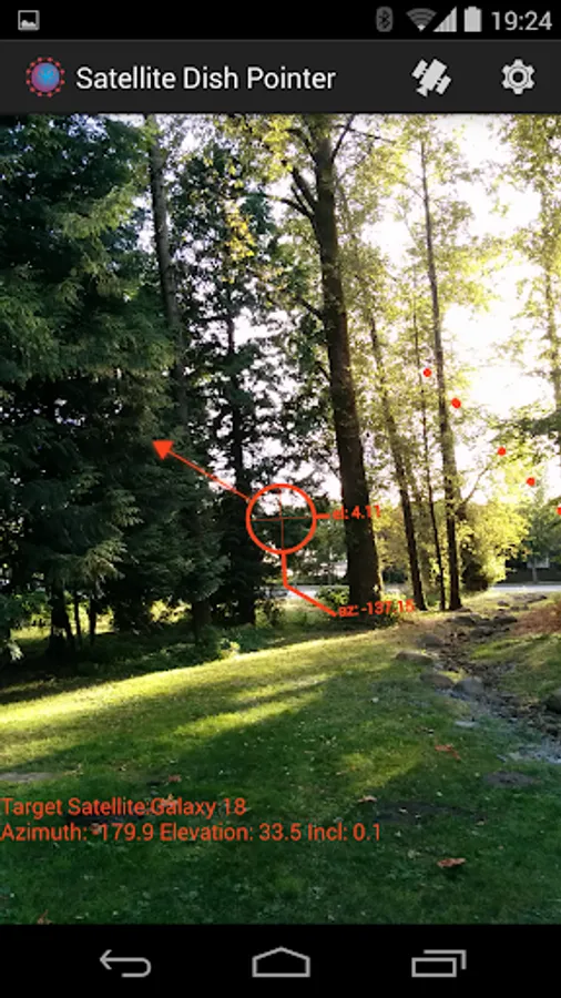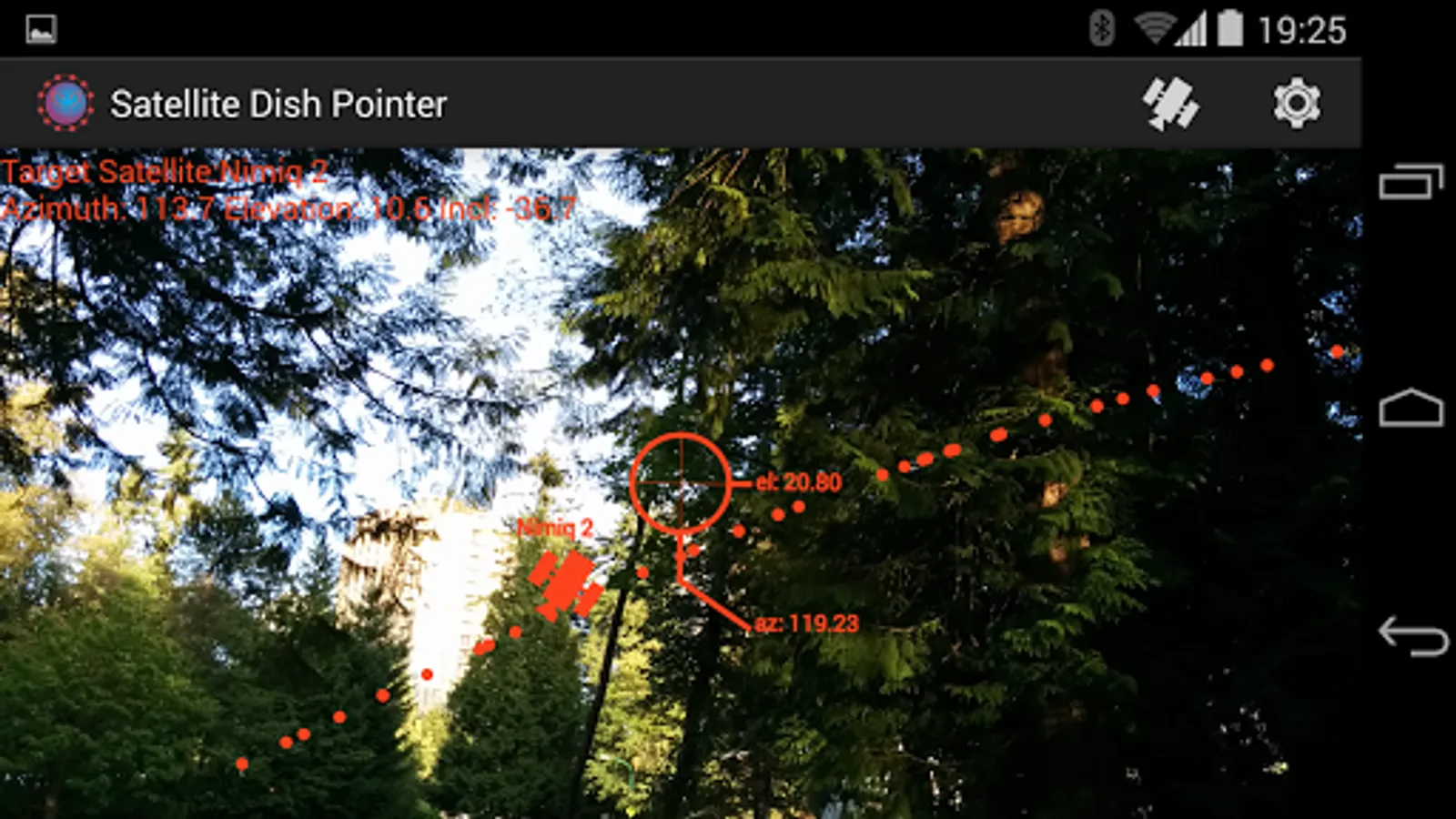 Activate your phone’s location capabilities (or enter your location in the settings menu), then select a satellite from our extensive list. The solution for the satellite will be displayed and an arrow will point to the location if it is off screen. The satellite is aligned when the satellite icon is centered in the reticle.