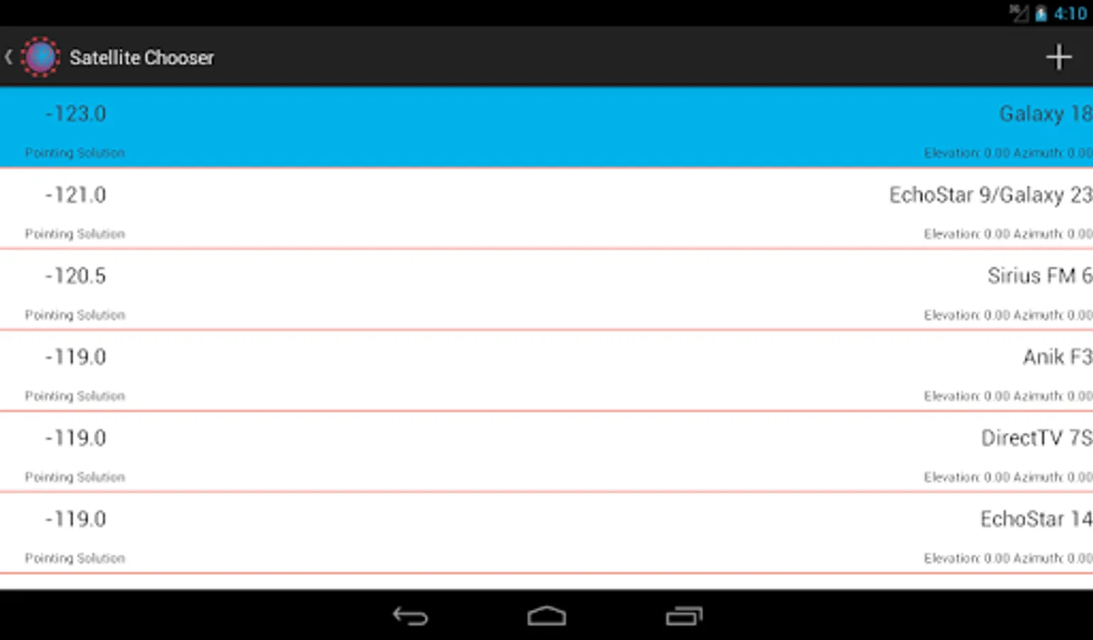 Satellite Dish Pointer comes with a user customizable list of over 230 geosynchronous satellites and has a very simple and intuitive display to guide you to where the satellite is in the sky.
