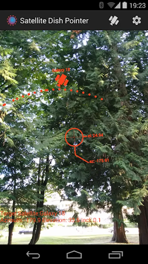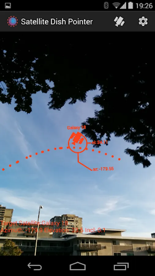 Activate your phone’s location capabilities (or enter your location in the settings menu), then select a satellite from our extensive list. The solution for the satellite will be displayed and an arrow will point to the location if it is off screen. The satellite is aligned when the satellite icon is centered in the reticle.